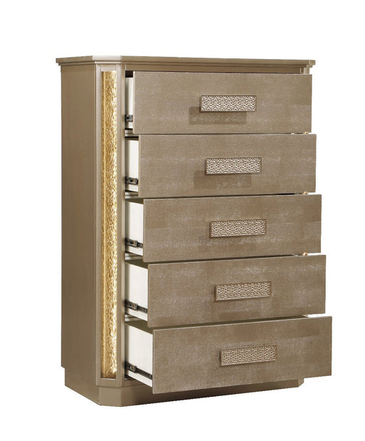 The epitome of fashion-forward design, this king upholstered panel bed is a beautiful blend of comfort and luxury. Shiny chrome-tone accents, a pea...