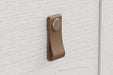- Faux leather drawer pulls with brass-tone rivets; light brown and gray options included