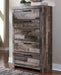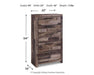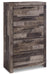 Modern yet hefty. This chest of drawers makes an urban eclectic statement. Seasoned raw wood look merges with the clean lined design we love today. Muted rustic finish over replicated pine grain maintains its authenticity. Roomy drawers are flanked with attractive framed front and pilasters. Handles with antiqued gunmetal finish complete this beauteous look with easy to pull function.