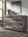 Modern yet hefty. This dresser makes an urban eclectic statement. Seasoned raw wood look merges with the clean lined design we love today. Muted rustic finish over replicated pine grain maintains its authenticity. Roomy drawers are flanked with attractive framed front and pilasters. Handles with antiqued gunmetal finish complete this beauteous look with easy to pull function.