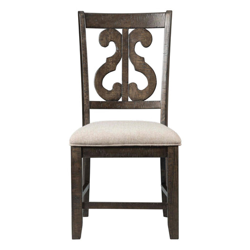 Dine in the comfort and rustic charm of this unique side chair with rake-back design. The cushioned seat, upholstered in a heavy woven fabric, is t...