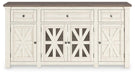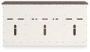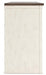 Whether your style is farmhouse fresh, shabby chic or country cottage, you’ll find this TV stand perfectly in tune. Its two-tone finish pairs a trendy textured antiqued white with weathered gray for that much more quaint character. Charming elements include crossbuck-adorned cabinet doors with glass inlays for peek-through flair. Ample storage space and cutouts for wire management nicely accommodate your media needs.